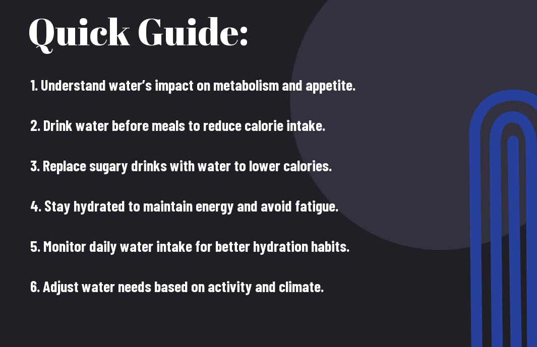 This guide will help you understand the significant impact that hydration has on your weight management journey. You may not realize that adequate water intake can help suppress your appetite, boost your metabolism, and even enhance your exercise performance. Neglecting your hydration needs can lead to negative health effects such as fatigue and confusion, potentially hindering your weight loss efforts. By prioritizing your hydration, you can take a vital step toward achieving your health goals effectively. Let's explore how water plays a transformative role in maintaining a healthy weight.