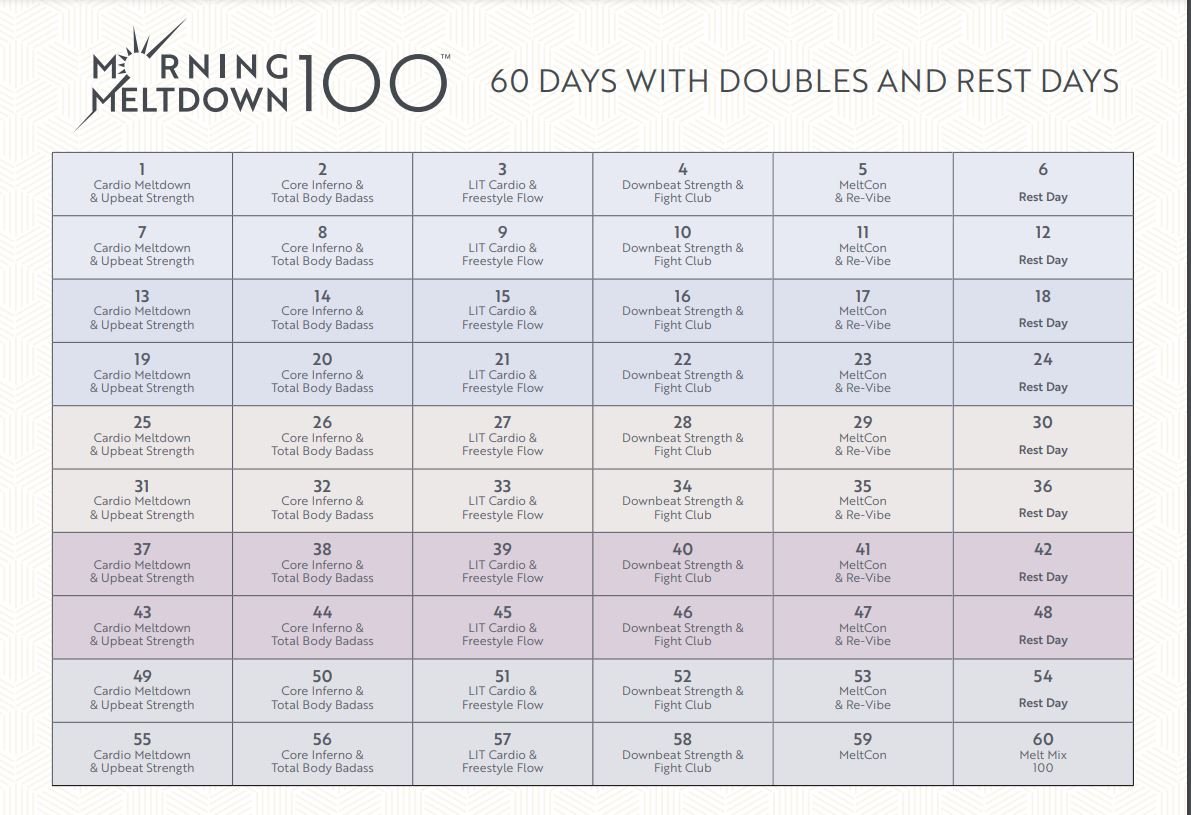 Say you don't have enough time. You wish to achieve a certain goal earlier or in fewer workouts per workout. This can be achieved by performing double workouts. Even though there is a 60 day calendar with pre planned doubles and rest days to complete your morning meltdown, I suggest starting with a 30 day schedule.