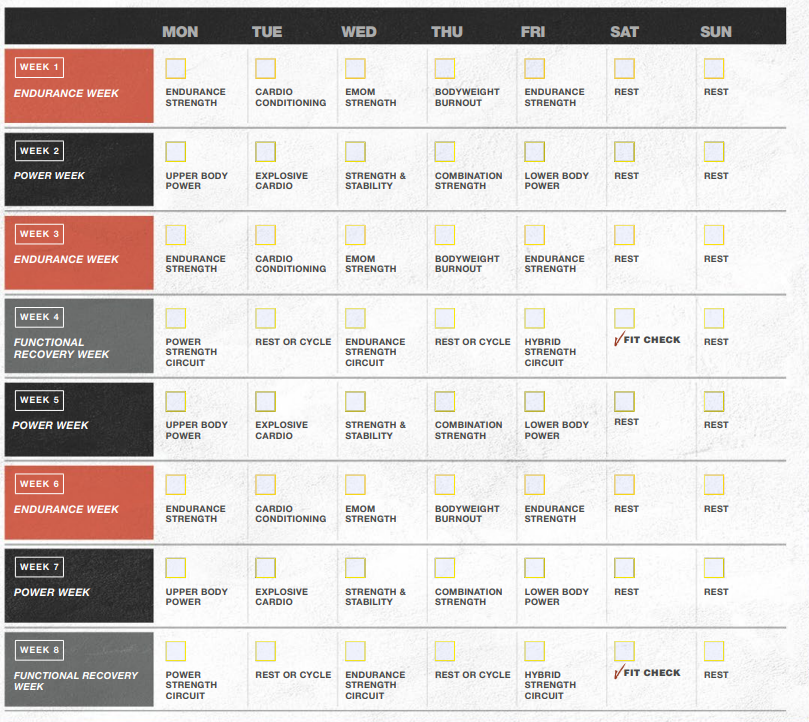 Each week, you'll alternate between two types of workouts. One week, you'll perform endurance weeks where you'll spend 30 minutes doing cardio conditioning. Then, the next week, you'll switch to strength weeks where you'll spend 60 minutes working out.
